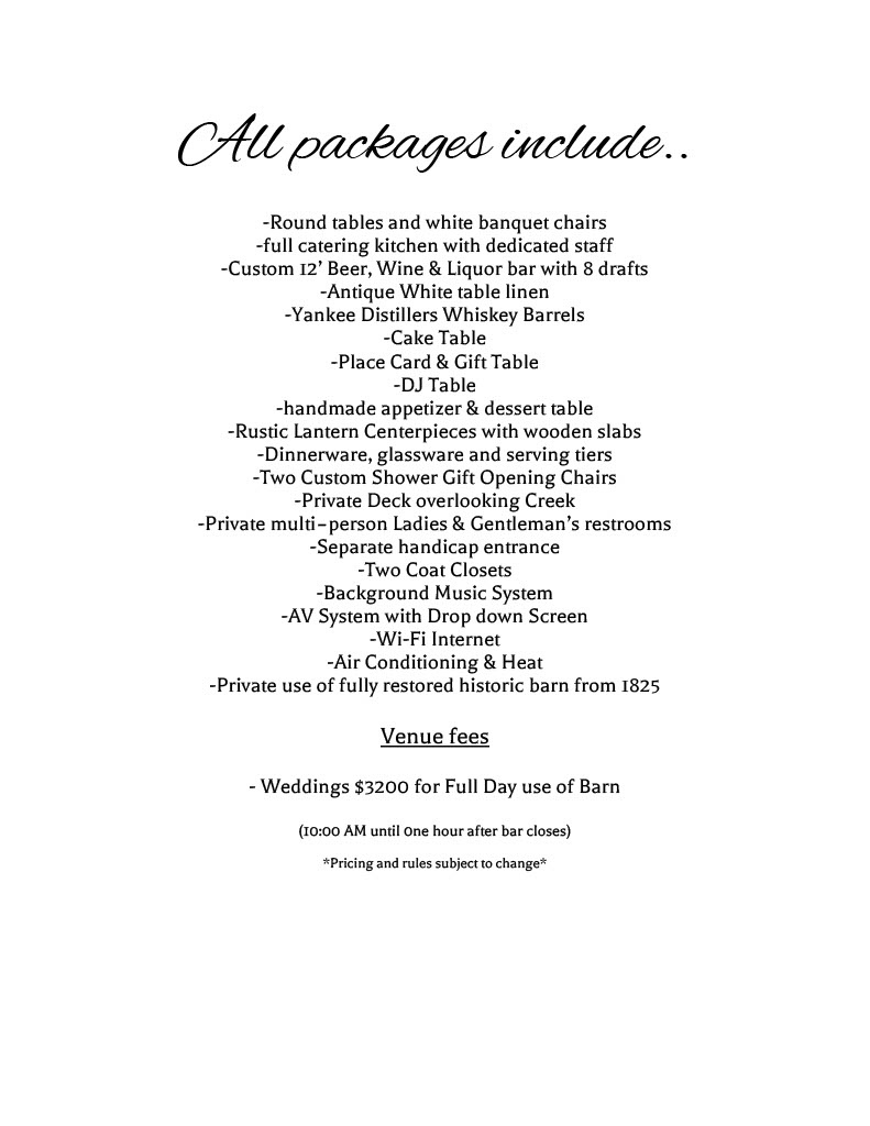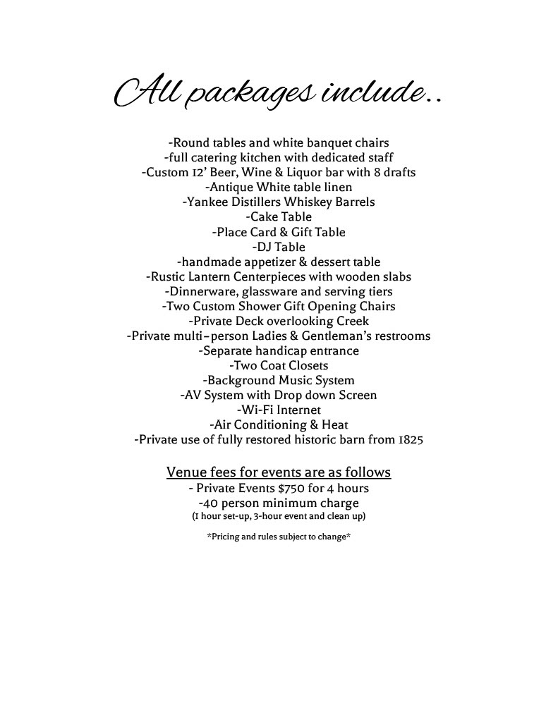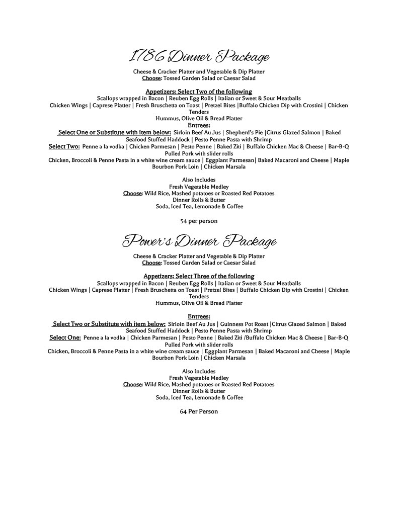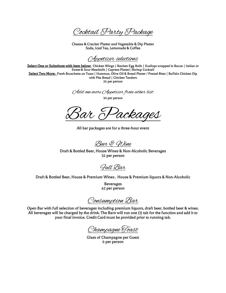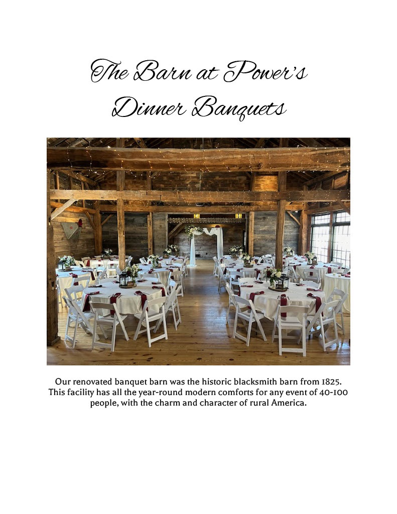 Our banquet barn was renovated from the historical 1825 era blacksmith barn adjacent to the tavern. This new facility has all the year round modern comforts for any event of 40 to 100 people with the same charm and character of early America.
